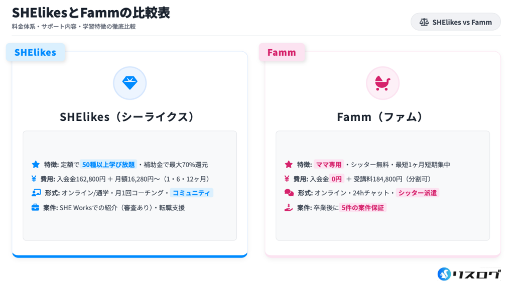 長期的なキャリアチェンジを考えるならSHElikes、スピード重視で副業を始めたいならFammという選択が明確になります。