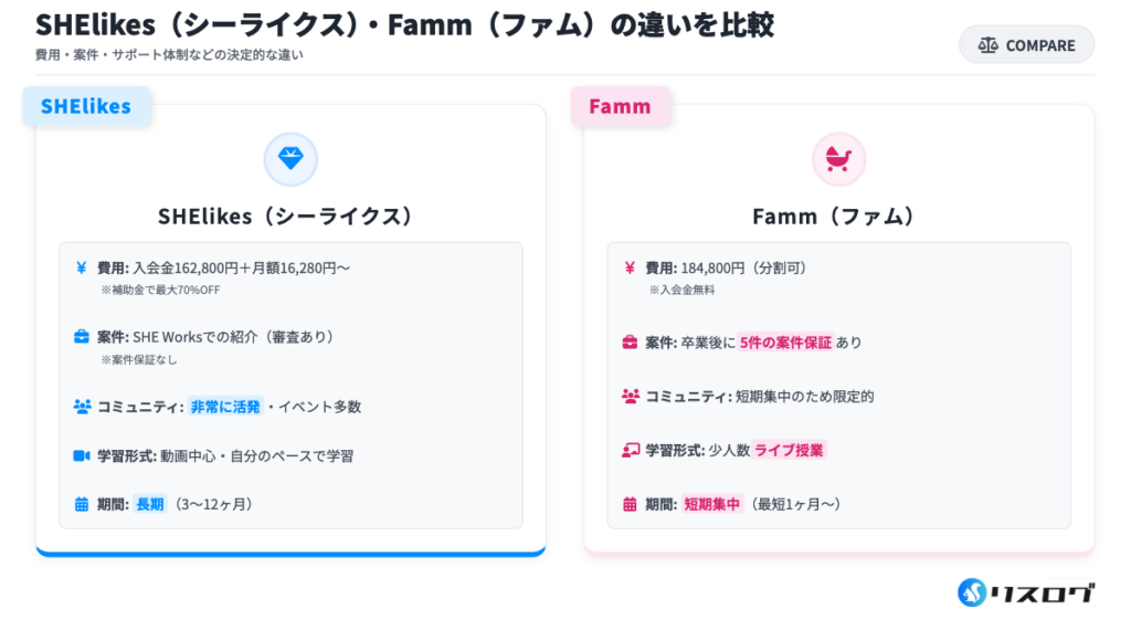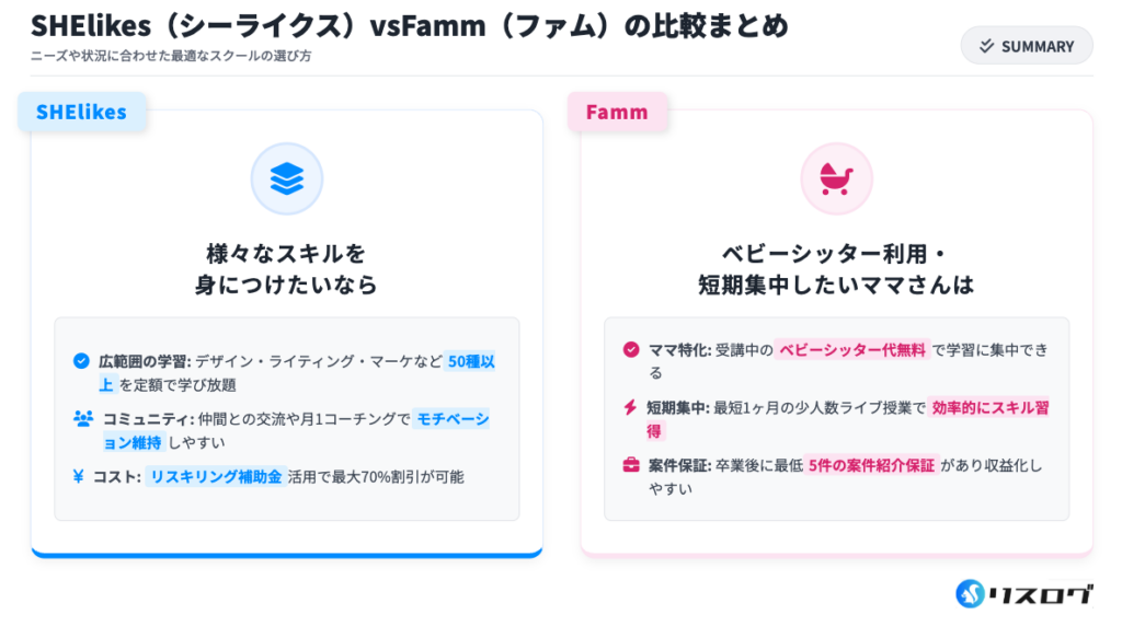長期的なキャリアチェンジを考えるならSHElikes、スピード重視で副業を始めたいならFammという選択が明確になります。