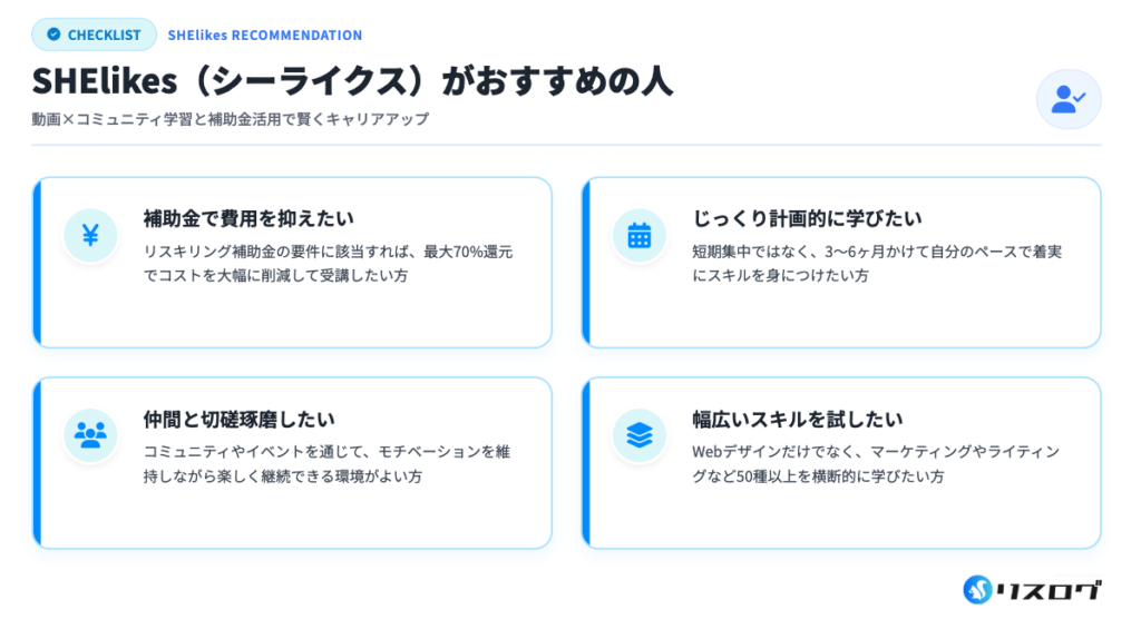 SHElikesは1〜6ヶ月、もしくはそれ以上の期間をかけて自分のペースで学習を進められるスクールです。動画教材と課題提出を軸に、無理のないスケジュールで学べるため、家事や仕事と両立しながらスキル習得を目指す方に向いています。