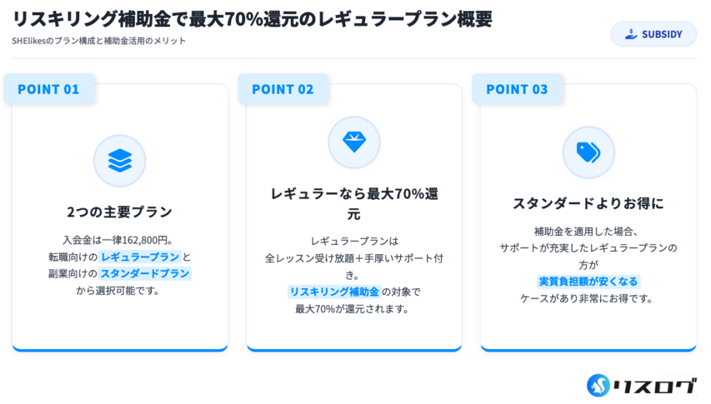 SHElikesでリスキリング補助金(人材開発支援助成金)を利用するには、まずレギュラープランを選ぶことが必須条件です。
