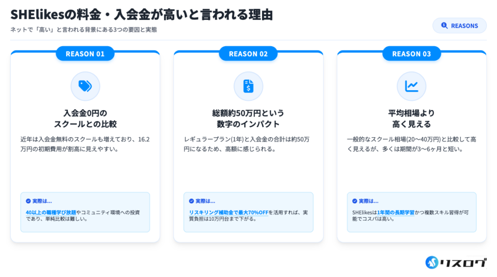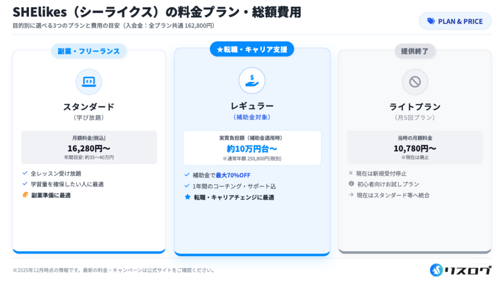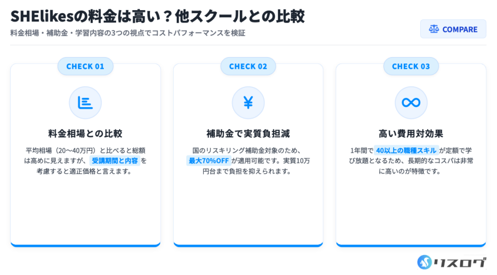 SHElikesは入会金が高めに見えるため「料金が高い」と思われがちですが、レギュラープランが国のリスキリング補助金の対象であり、実質負担は大きく下がります。