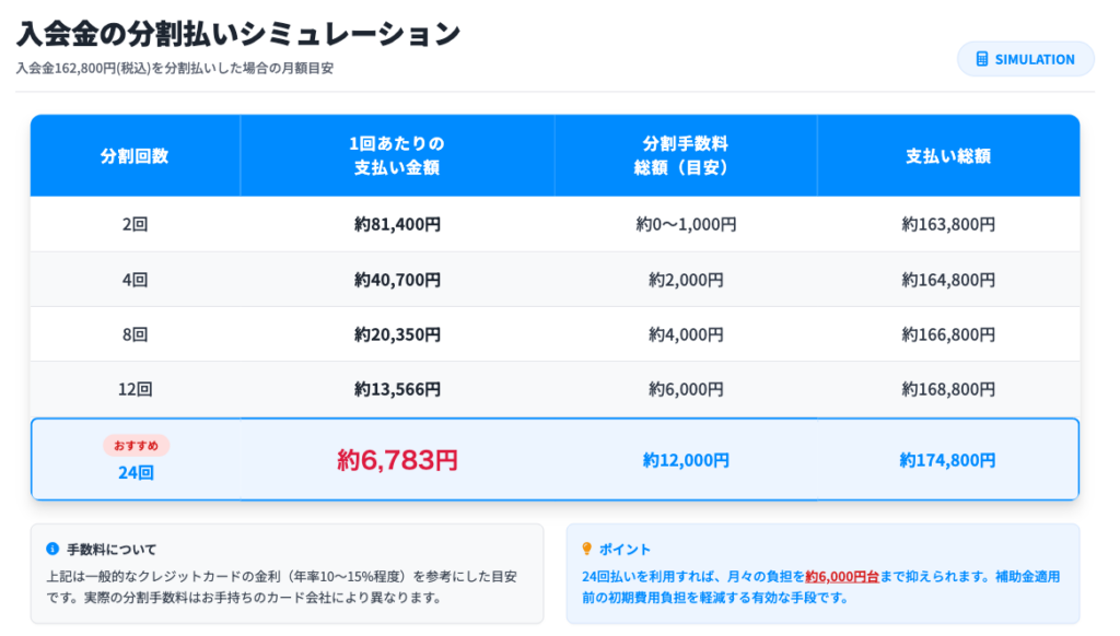 以下は、レギュラープラン入会金を分割した場合のシミュレーションです(分割手数料は一般的な目安で算出)。