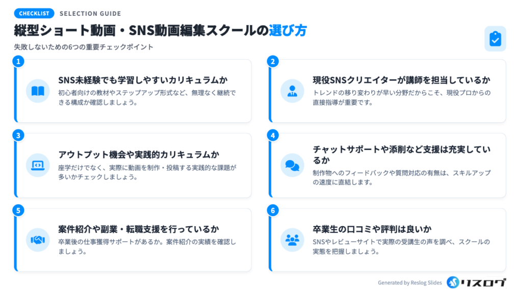 スクールでは動画編集に加えて、台本の作り方、投稿後の数値の見方、改善の考え方まで学べるケースが多いです。