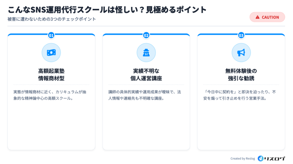 個人運営のSNS運用代行スクールの中には、質の高い講座も存在しますが、運営実態が不透明なケースも多く注意が必要です。