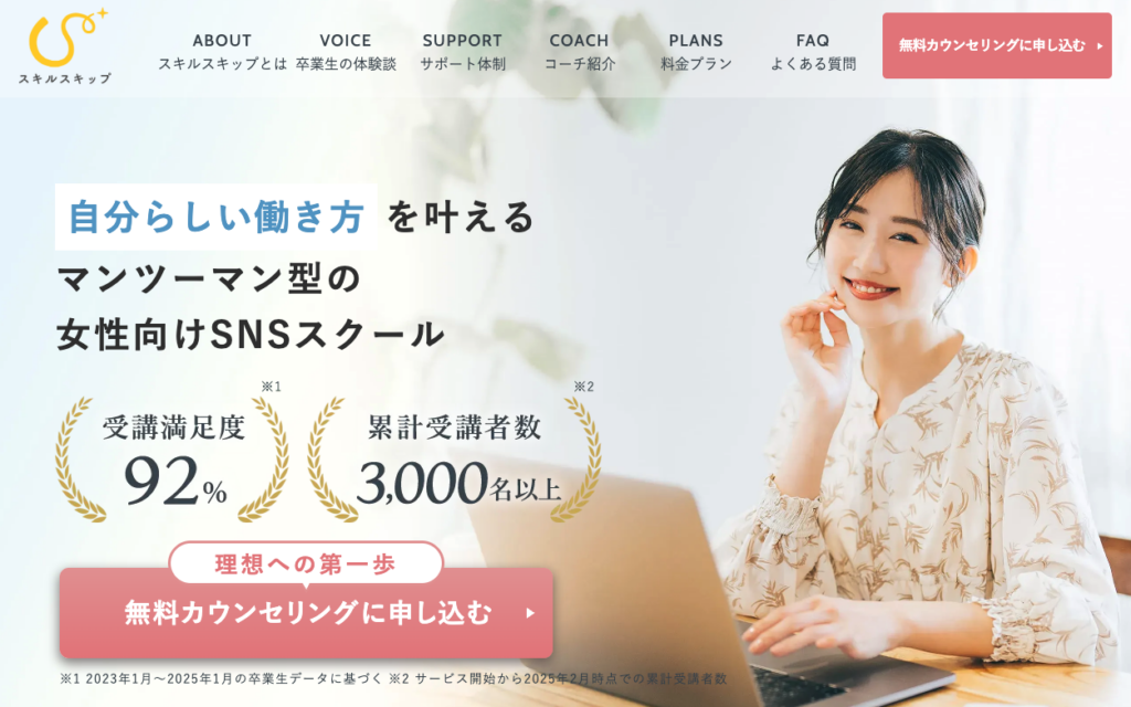 WEBCOACH(ウェブコーチ)は、特に女性を対象としたオンライン完結型のWeb系キャリアスクールです。最大の特徴は、47種類以上のWebスキルを網羅的に学べるカリキュラムと、現役フリーランスによるマンツーマンサポートです。