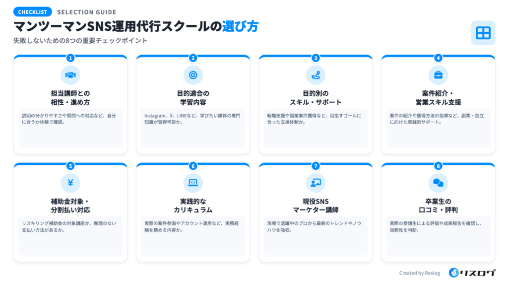 マンツーマンスクールでは、講師の質がそのまま学習の質に直結します。現役でSNS運用代行やマーケティングの現場に立っているプロが講師を担当しているかを必ず確認しましょう。