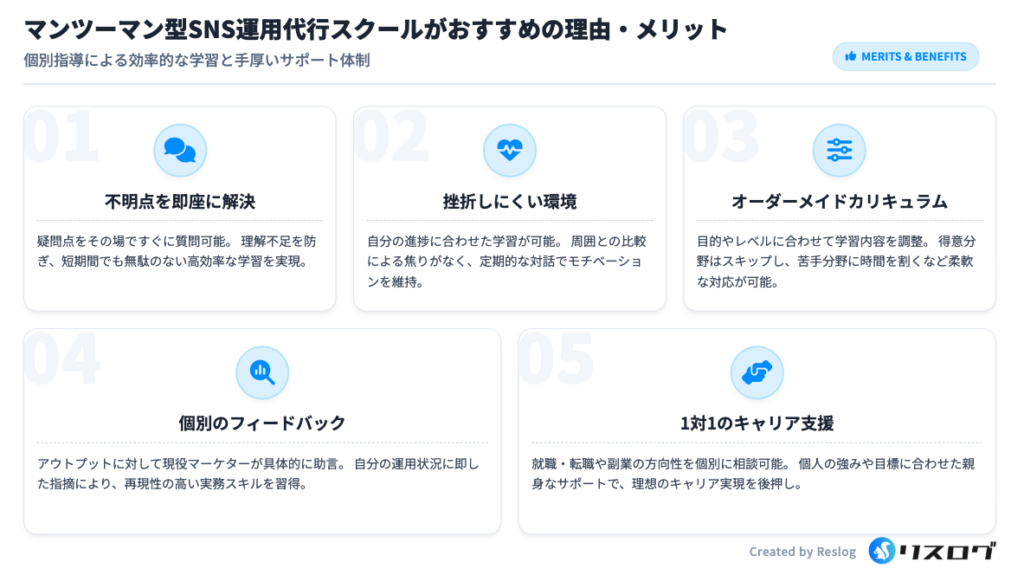 マンツーマン型の強みは、実践的な学習を個別にサポートしてもらえる点です。そのため、座学中心ではなく、実際のアカウント運用や案件参画を通じて学べるカリキュラムかどうかを確認しましょう。