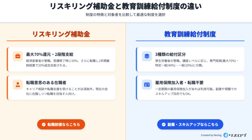 転職前提で受講する場合はリスキリング補助金、在職中のスキルアップや副業目的であれば教育訓練給付金が向いているケースが多いです。自分のキャリア目的に合わせて、最適な制度を選びましょう。