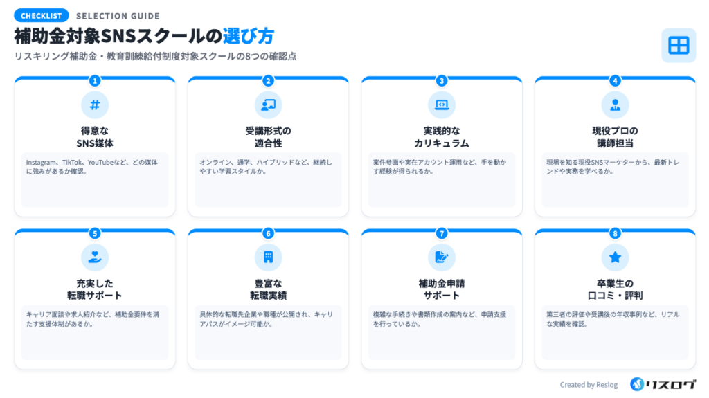リスキリング補助金は、経済産業省が指定・認可した講座のみが対象となるため、すべてのSNS運用代行スクールで利用できるわけではありません。