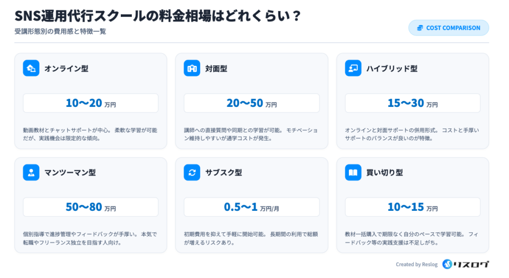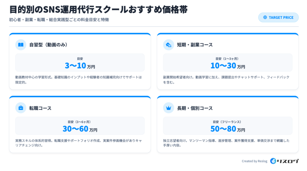 短期・副業コースは、10〜30万円程度が相場で、SNS運用代行を副業として始めたい人に最も選ばれている価格帯です。