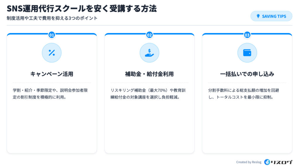 SNS運用代行スクールを少しでも安く受講したい場合、まずチェックしたいのが各種キャンペーンの有無です。