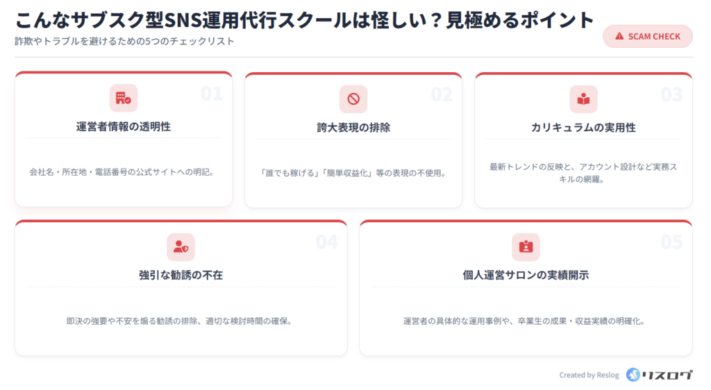 サブスク型SNS運用代行スクールの中には、個人運営のコミュニティやサロン形式のものもあります。すべてが悪いわけではありませんが、運営者の実績や過去の運用事例、卒業生の成果が不明瞭な場合は注意が必要です。