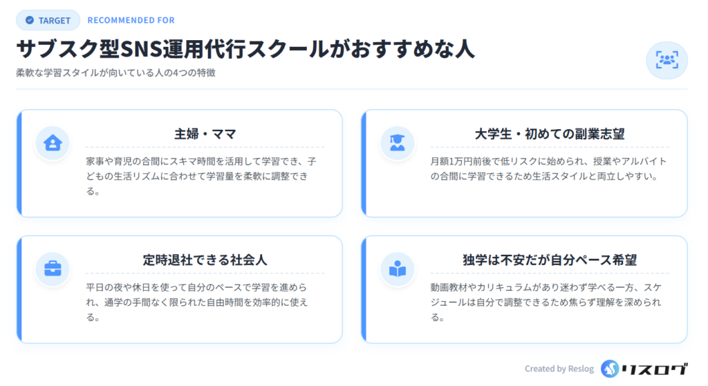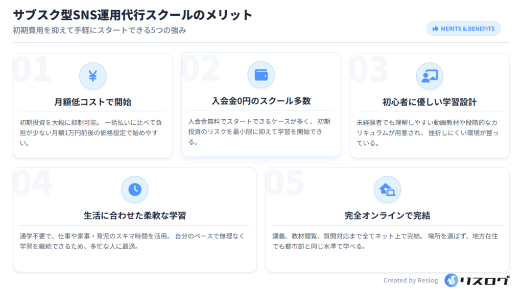 高額スクールにいきなり申し込むことに不安を感じる人にとって、サブスク型は「お試し感覚」で始められる学習環境と言えます。また難易度が比較的抑えられているため、挫折しにくく、SNS運用代行に対する全体像を掴みやすいのもメリットです。