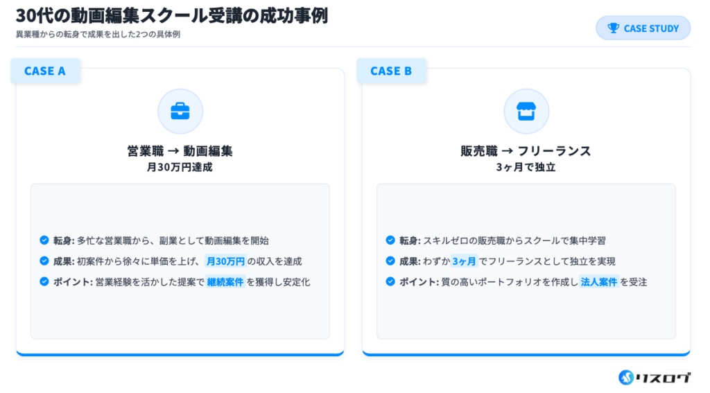 営業で培ったコミュニケーション力が、動画制作のヒアリングや提案に活かせたことも成功要因です。この事例は、動画編集スキルが単なる技術習得にとどまらず、キャリアチェンジの強力な武器になることを示しています。