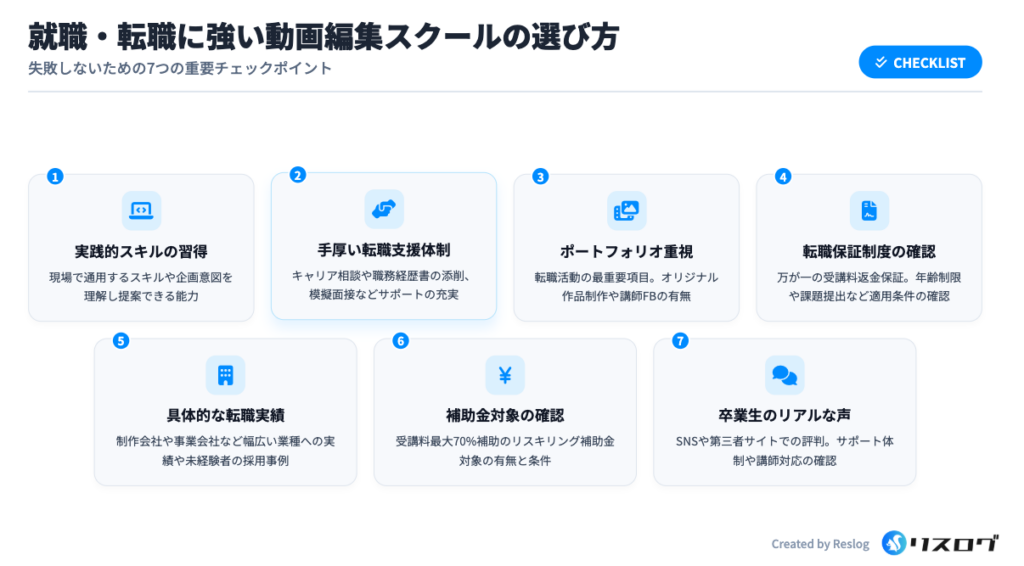 動画編集スクールの中には、転職・就職支援が手厚いスクールはありますが、完全な「転職保証型」はWebマーケティングやエンジニアスクールと比べると多くありません。