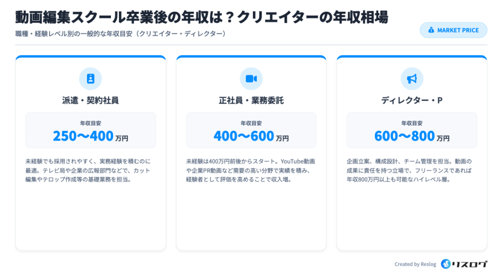 YouTube動画編集や企業PR動画、SNS広告用動画など、需要の高い分野で実績を重ねると、経験者として評価され年収400〜600万円を狙えるようになります。