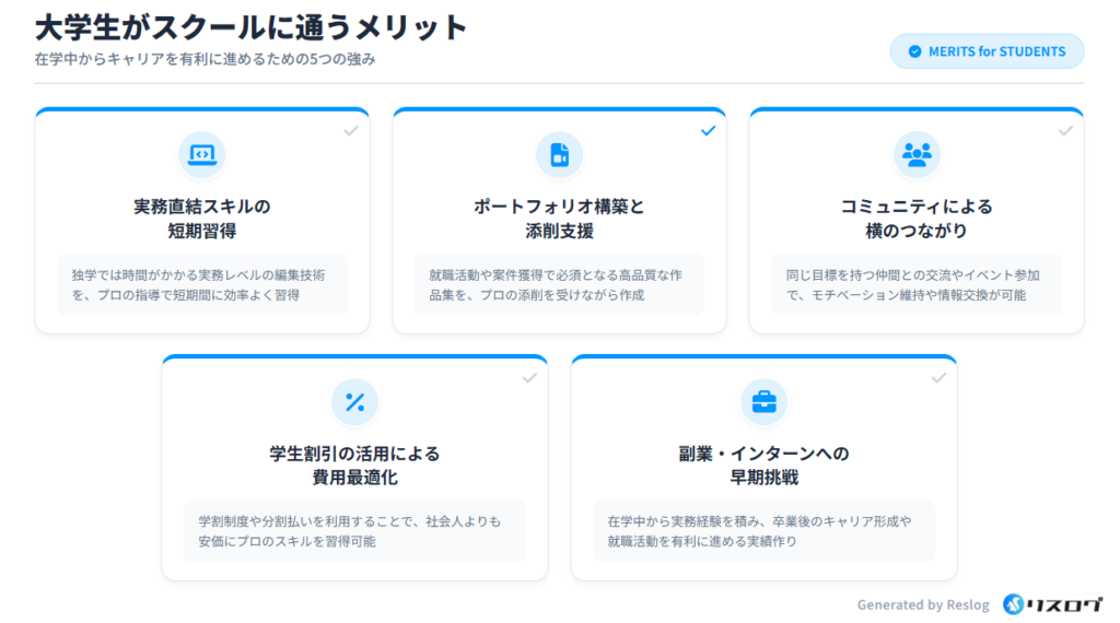 授業の合間や夜間に作業できる点も、大学生との相性が良いポイントです。アルバイトより時給が高く、スキルが資産になる副業として動画編集を選んだ点が特徴的です。