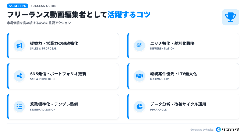 フリーランスの動画編集者にとって自身のスキルは最も重要な資産です。その価値を維持・向上させ続けることが生命線となります。