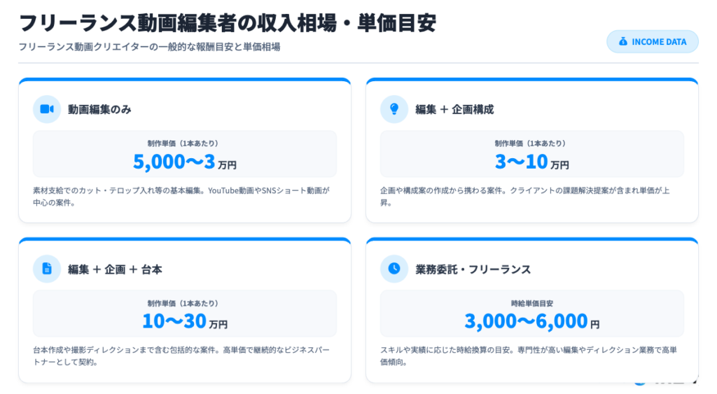 ここではフリーランスや副業における動画編集の収入相場・案件単価・時給の目安について解説します。