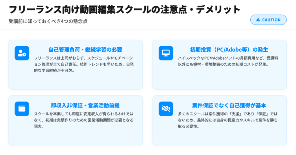 さらに、卒業後の案件獲得についても必ず保証されるわけではなく、積極的な自己PRや営業活動が必要です。安易に「受講後すぐに稼げる」と考えるのではなく、自分の努力次第で結果が左右されることを理解しておきましょう。