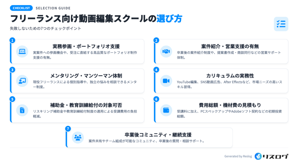 フリーランスとして独立や副業を考えている方は、動画編集スクールの受講を検討している方もいるでしょう。しかしスクールには転職に強い・副業やフリーランスに強みがあるコースなど、特色があります。