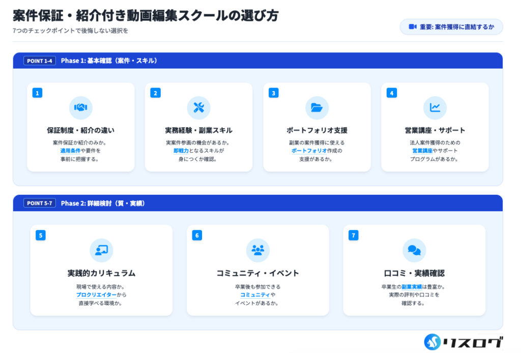 案件保証や紹介付きの動画編集スクールは、未経験者でも短期間で副業に直結するスキルを習得できる点が大きなメリットです。