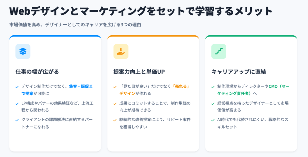 Webデザインとマーケティングを同時に学ぶことは、将来的なキャリアアップにも直結します。