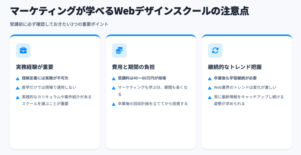 Webデザインスクールでマーケティングの基礎を学ぶことはできますが、実際の仕事で成果を出すには、やはり実務経験が欠かせません。