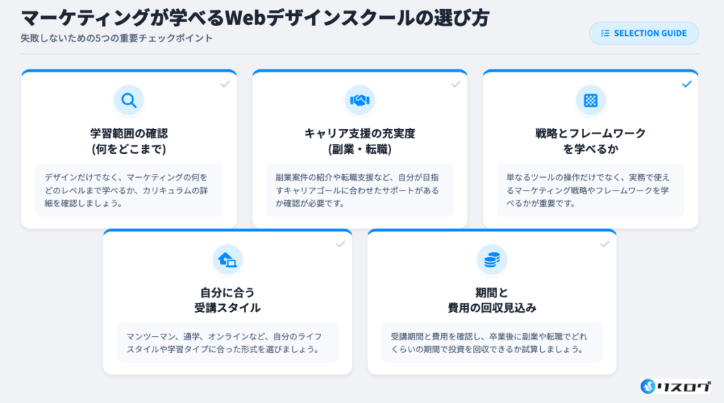 マーケティングも同時に学習したい場合、デザインだけでなく広告運用やSEO、アクセス解析といった幅広い内容をカリキュラムに取り入れているかをチェックします。