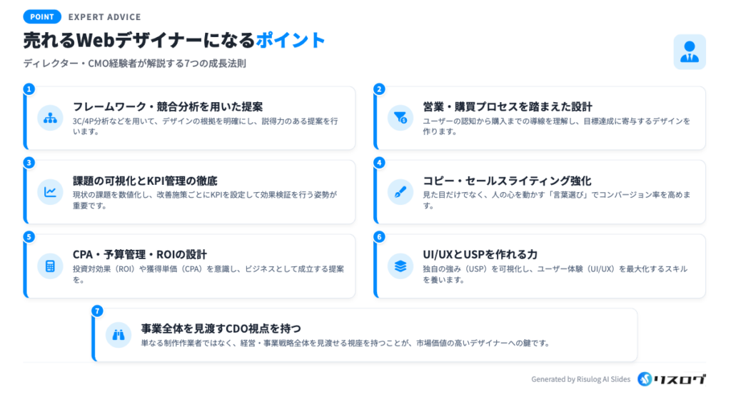 売れるWebデザイナーになるには、ただデザインをするだけでなく、現状の課題を把握し、改善施策を提案できる力が重要です。