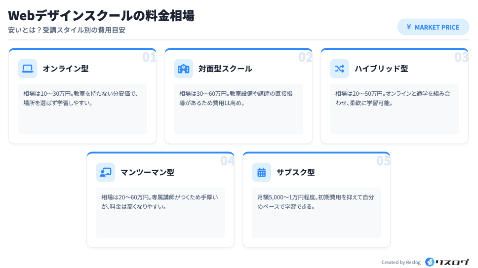 Webデザインスクールの費用は、単純に高い・安いではなく、受講期間とサポート内容の組み合わせで決まるのが一般的です。