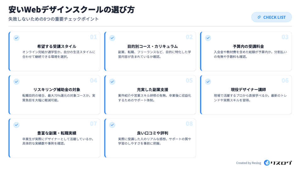 転職を目的にWebデザインスクールを受講する場合は、リスキリング補助金や教育訓練給付金の対象コースかどうかを必ず確認しましょう。