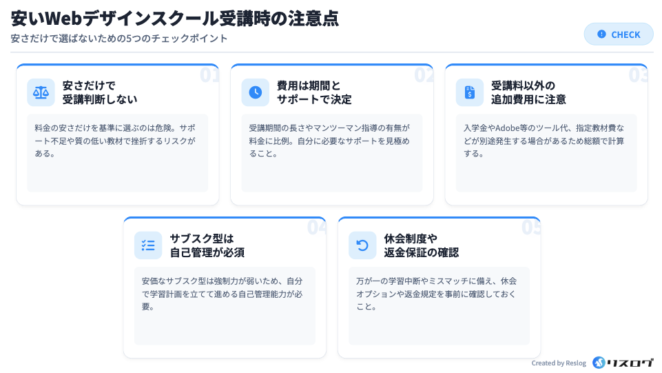 安いWebデザインスクールは魅力的に見えますが、価格だけで判断すると後悔するケースも少なくありません。