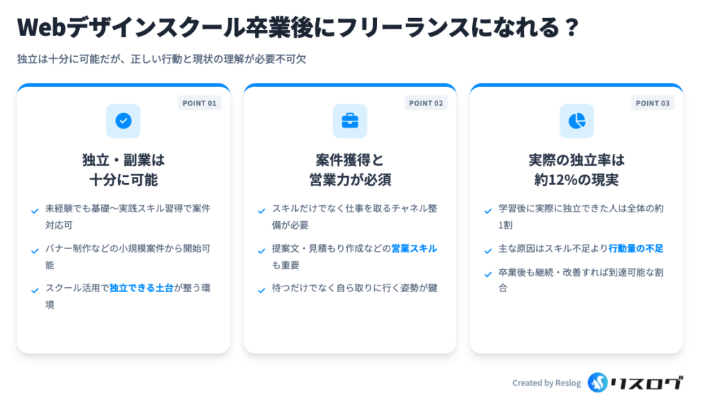 スクールはあくまでスタート地点であり、卒業後も継続的な学習と実務経験を積める人ほどフリーランスとして成功しやすくなります。