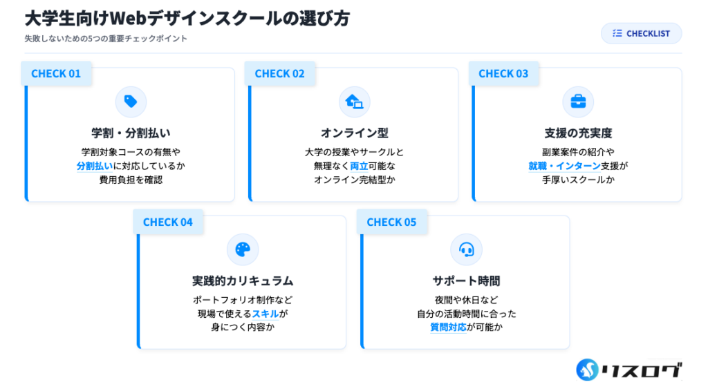 大学に通学しながらWebデザインを学習したいが、両立できるか不安・料金面が不安といった方もいるかもしれません。また大学生のうちに特権を活かして、少しでも安く受講したいという方もいるでしょう。