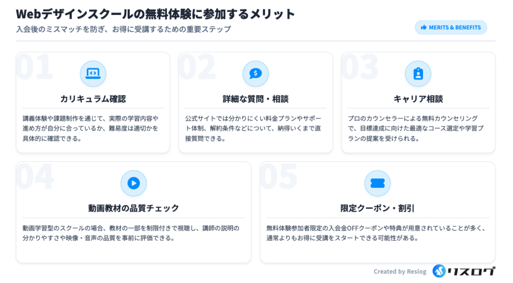 Webデザインスクールの無料体験に参加する最大のメリットは、実際の講義内容や課題制作を通して、カリキュラムや学習スタイルが自分に合っているかを事前に確認できる点です。