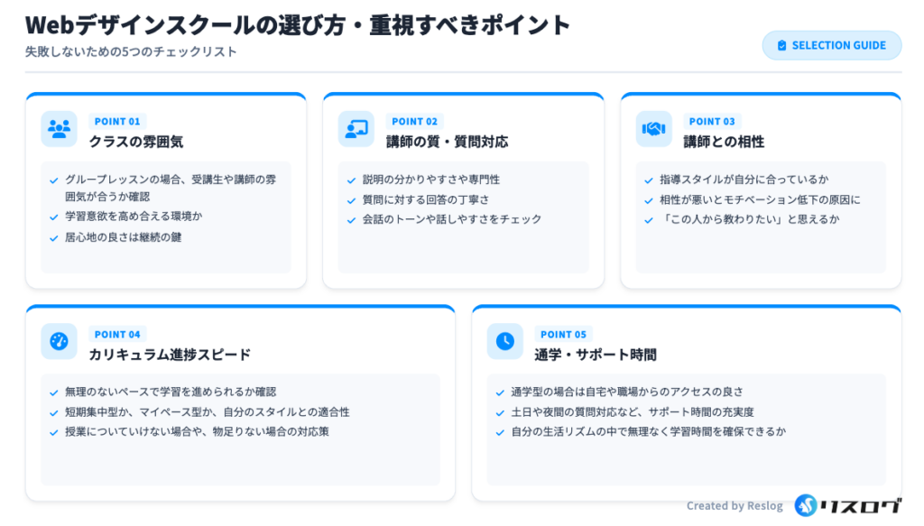 Webデザインスクールの満足度を大きく左右するのが、担当講師の質です。講師が現役デザイナーかどうかだけでなく、質問に対してどれだけ丁寧に、分かりやすく対応してくれるかも重要な判断基準になります。