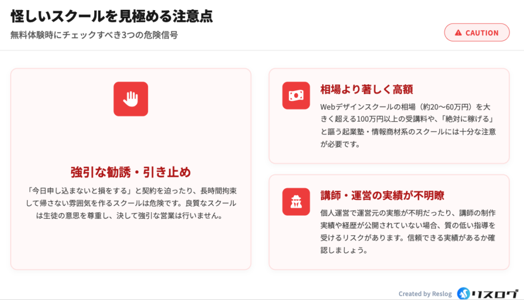 個人運営のWebデザインスクールすべてが悪いわけではありませんが、講師の実績や経歴が不透明な場合は注意が必要です。