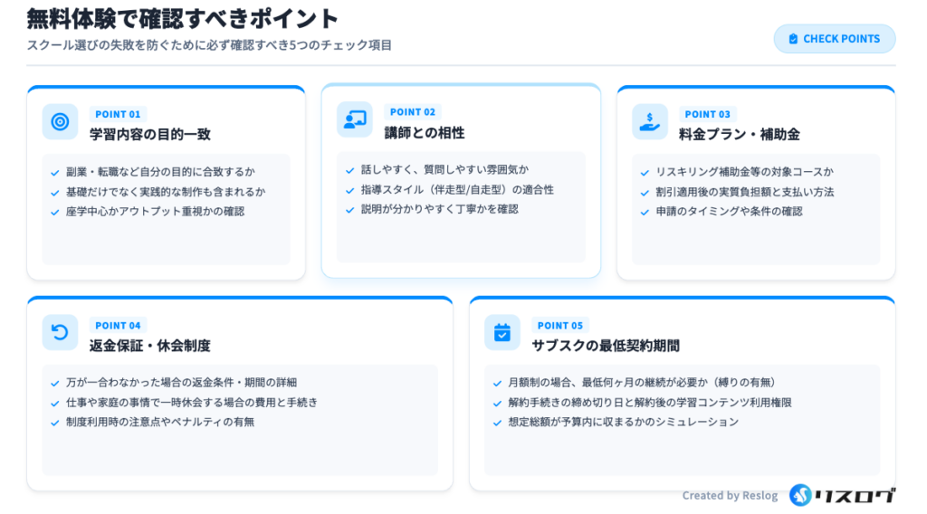 無料体験は、スクールの雰囲気だけでなく、自分のゴールに対して必要な内容が網羅されているかを見極める場として活用することが大切です。