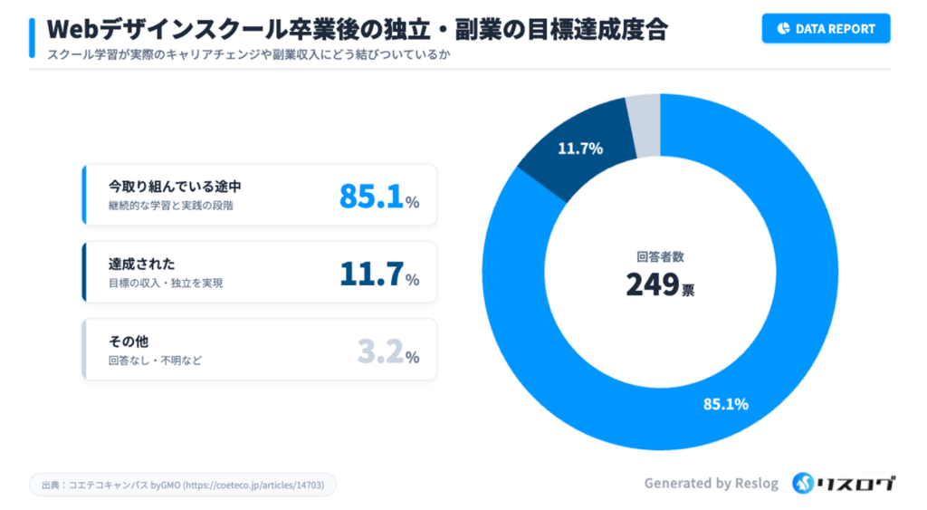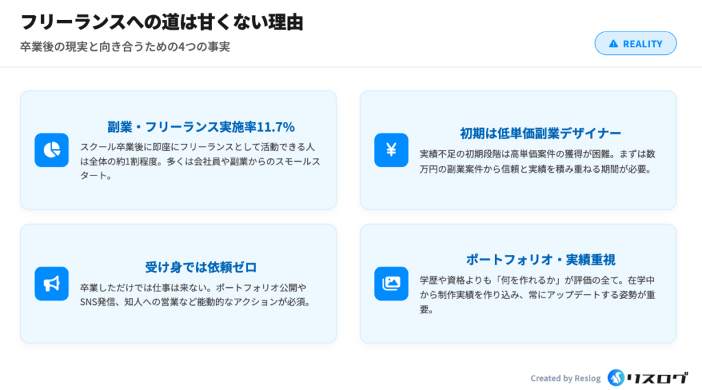 この数字からも分かる通り、スクール卒業=即フリーランスという認識は現実的ではありません。スキル習得はあくまでスタート地点であり、案件獲得や実務経験を積み重ねる期間が必要になります。