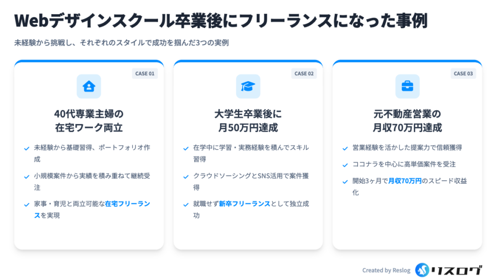 こちらは、大学在学中にWebデザインスクールを受講し、卒業後に月50万円の収益化を達成した学生の事例です。