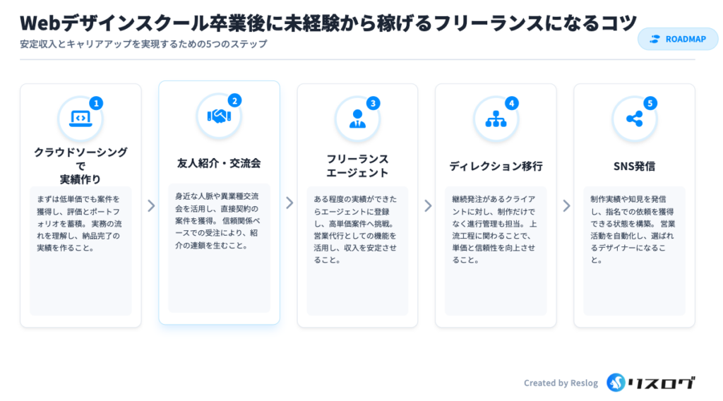 Webデザインスクールで学んだ基礎知識やマーケティング視点がここで活きてきます。作業者から管理者へと役割を広げることで、収入の天井を引き上げられます。
