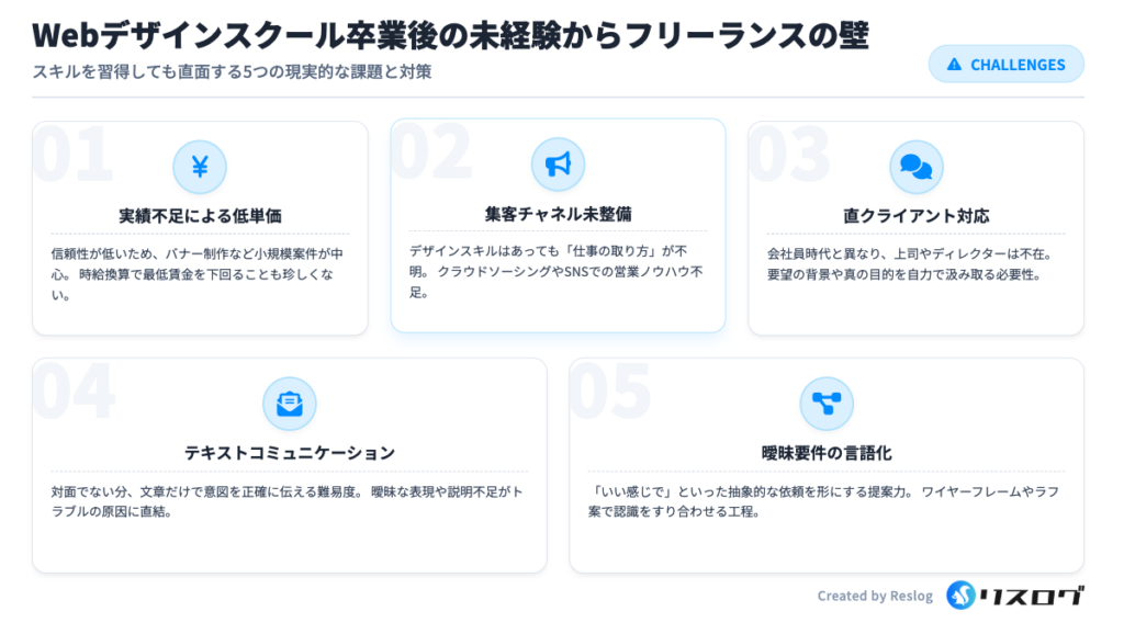 スクールではデザインスキルを中心に学ぶことが多く、仕事を取るための集客や営業、提案のスキルまでは十分に身につかないケースがあります。