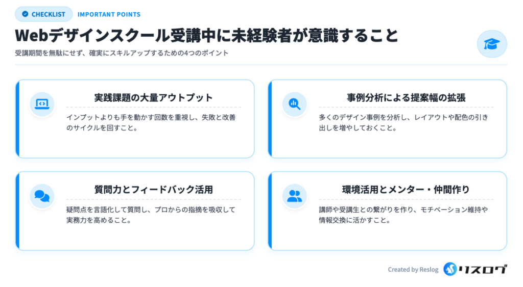 スクール受講中から、講師やメンターに積極的に質問し、フィードバックをもらう姿勢を身につけておくことが重要です。