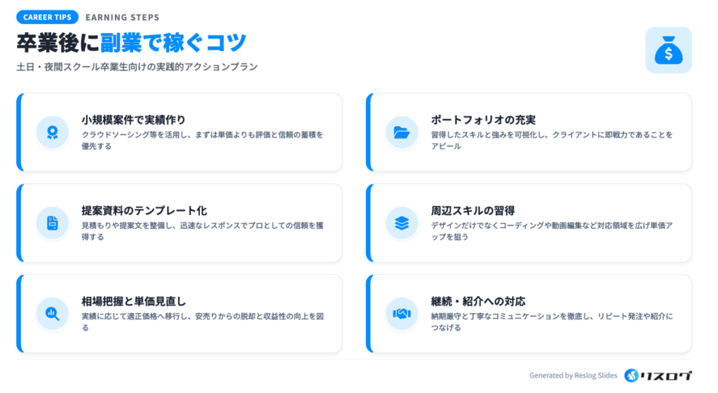 スクールで学んだスキルを活かし、長期的なパートナーシップを築くことが、安定した副業収入の鍵です。