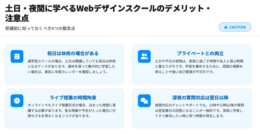 土日・夜間に学べるWebデザインスクールのデメリット・注意点