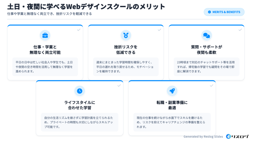 平日は本業に集中しながら、週末や仕事終わりの時間を使って副業スキルを習得できるため、キャリアの選択肢が広がります。