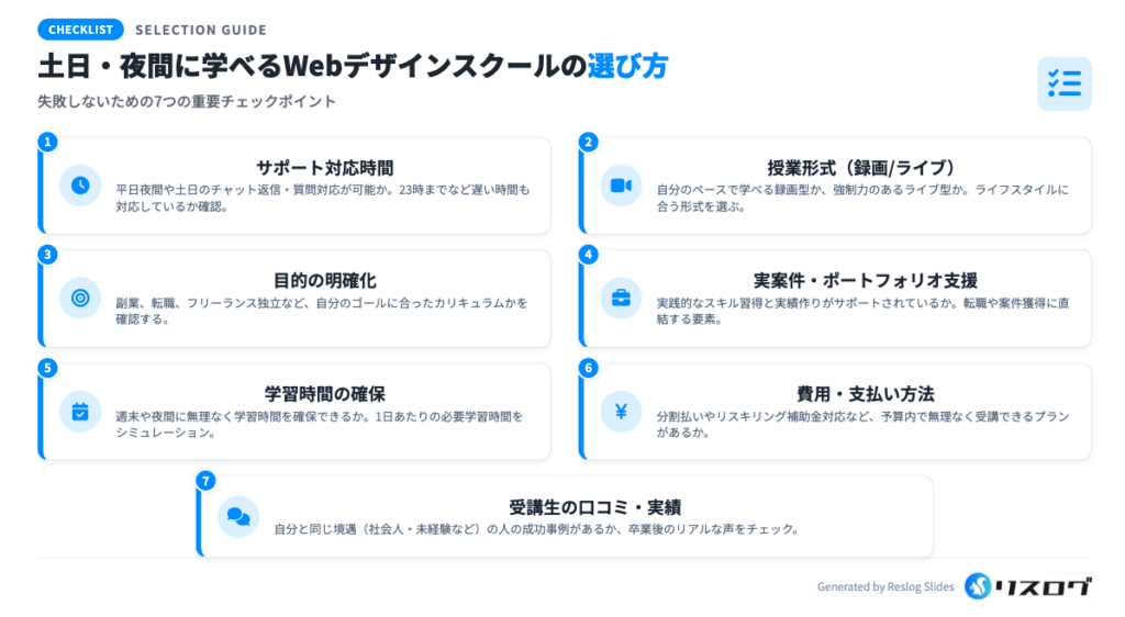 特に土日・夜間対応のスクールは、社会人や学生のライフスタイルに合わせて柔軟なサポートを提供しており、質問対応やフィードバックが充実しているため、挫折しにくい環境が整っています。