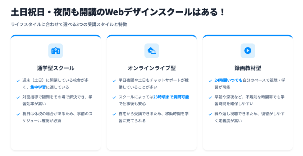 オンライン型スクールは録画講義やチャットサポートがあるため、急な予定変更にも対応しやすいですが、ライブ授業中心のスクールは時間の制約が大きくなります。