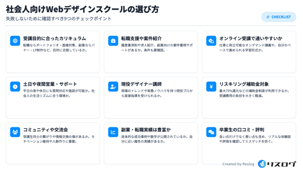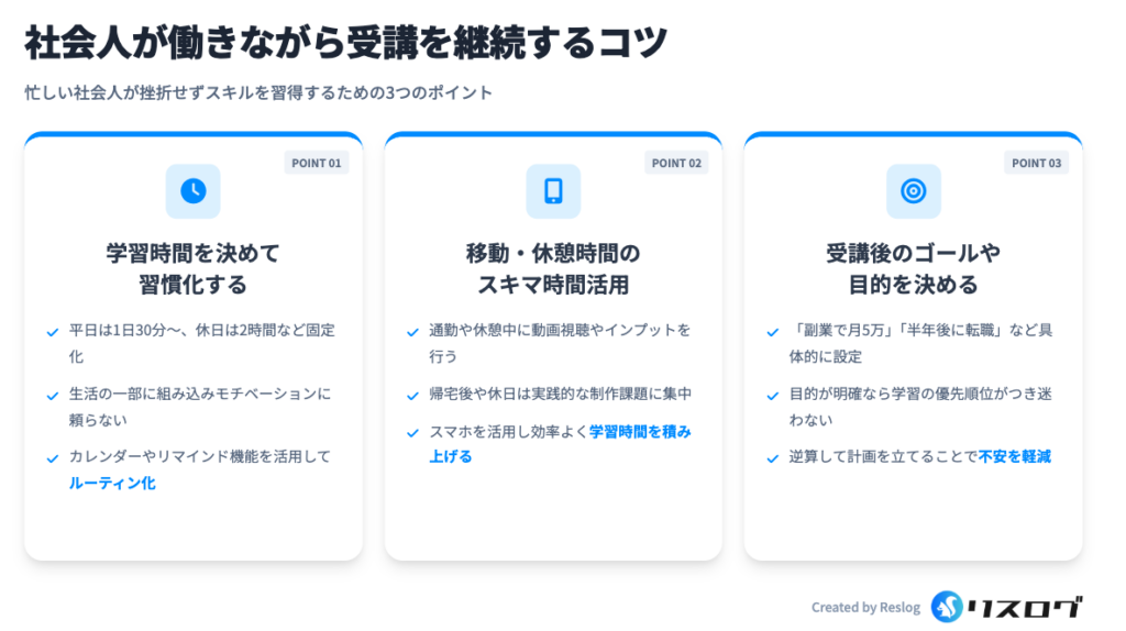 社会人の場合は「いつ学べるか」が継続のカギになるため、柔軟な受講スタイルかどうかを必ずチェックしましょう。